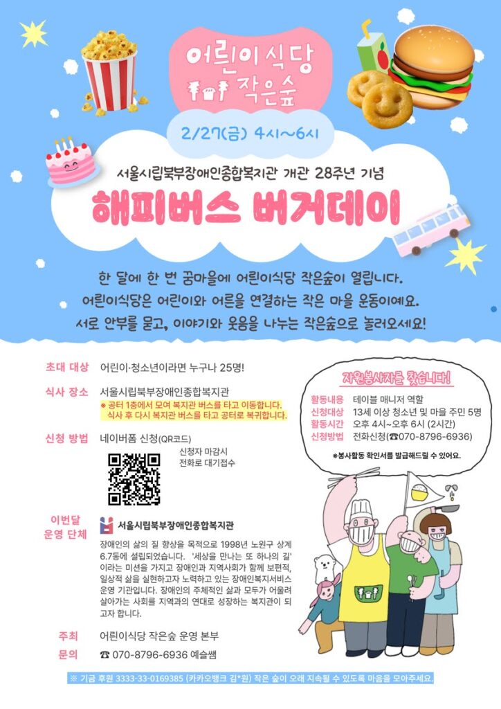 어린이식당작은숲 2/27(금) 4시~6시 서울시립북부장애인종합복지관 개관 28주년 기념해피버스 버거데이 한 달에 한 번 공릉에 어린이식당 작은숲이 열립니다.어린이식당은 어린이와 어른을 연결하는 작은 마을 운동이에요.서로 안부를 묻고, 이야기와 웃음을 나누는 작은숲으로 놀러오세요! 초대 대상어린이·청소년이라면 누구나 25명! 식사 장소서울시립북부장애인종합복지관※ 공터 1층에서 모여 복지관 버스를 타고 이동합니다.식사 후 다시 복지관 버스를 타고 공터로 복귀합니다. 신청 방법네이버폼 신청(QR코드)신청자 마감 시 전화로 […]