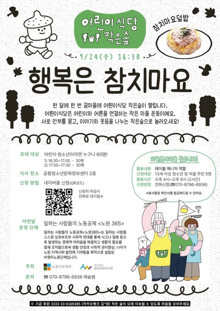 <어릔이식당 작은숲> 신청 “행복은 참치마요!” 한 달에 한 번 꿈마을에 어릔이식당 작은숲이 열립니다. 어릔이식당은 어린이와 어른을 연결하는 작은 마을 운동이예요. 서로 안부를 묻고, 이야기와 웃음을 나누는 작은숲으로 놀러오세요! 행사일시: 9월 24일(수) 오후 4시 30분~5시 30분 초대대상: 어린이·청소년 60명! 4:30~5:00 – 30명 5:00~5:30 – 30명 신청 마감시 전화(070-8796-6936)로 대기 접수 식사장소: 공릉청소년문화정보센터 2층 이번달 운영단체: 노원 […]