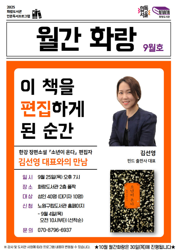 월간 화랑 9월호2025 화랑도서관 독서문화프로그램 이 책을 편집하게 된 순간 한강 장편소설 『소년이 온다』 편집자 김선영 대표와의 만남 김선영핀드출판사 대표