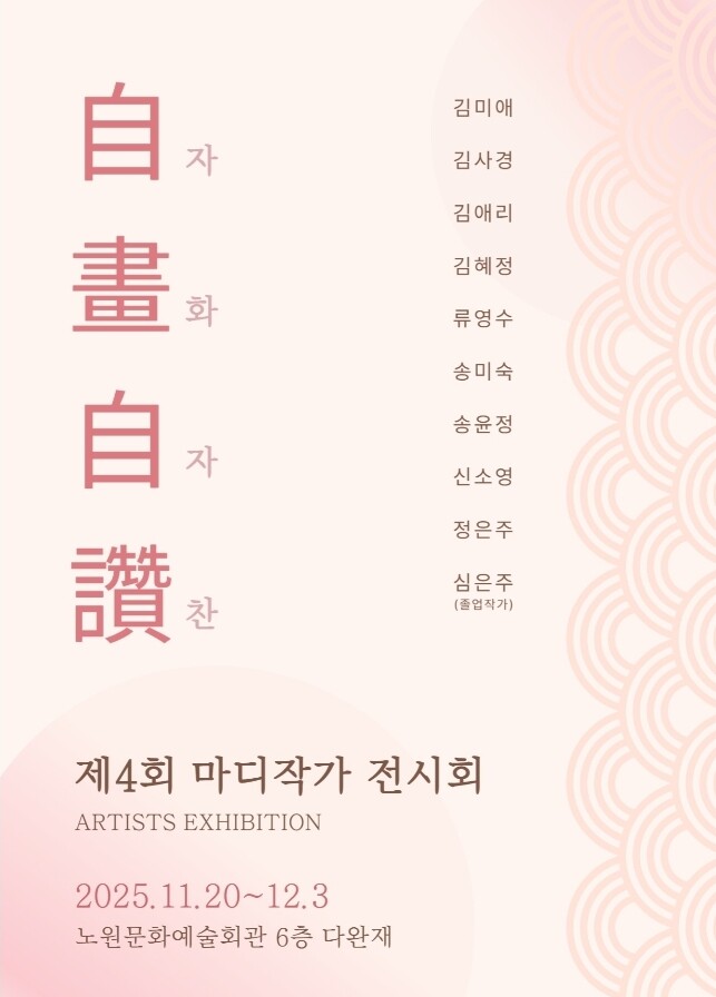 제4회 정기전시회에 초대합니다 깊어가는 계절, 귀한 분들을 ‘마디상회’의 네 번째 정기전에 모십니다. 🙏주제: 자화자찬 (自畵自讚) 이번 전시에는 지난 창작의 여정을 조심스럽게 돌아보고, ‘다음 한 걸음’을 위한 성장을 긍정하는 의미를 담았습니다. 작가들의 진솔한 다짐과 이야기가 담긴 작품들에 여러분의 귀한 응원의 힘을 얻고자 합니다. 오프닝행사를 준비했으니부디 오셔서 자리를 빛내주시면 감사하겠습니다. [오프닝 행사] 🍵 [전시 안내] 마디상회 드림