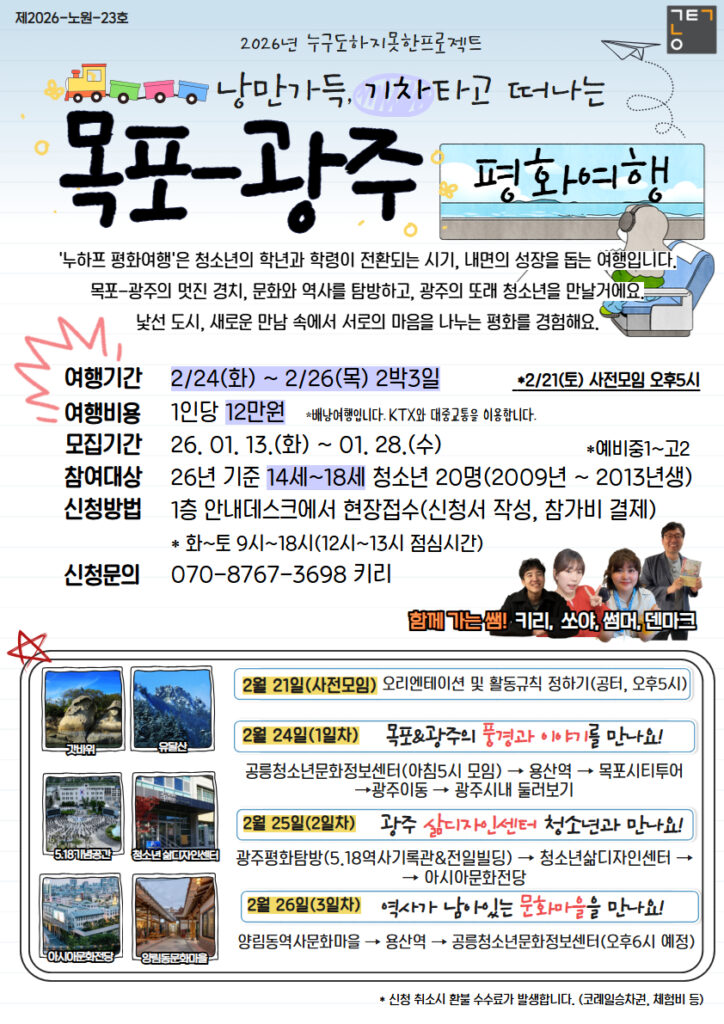 2/24(화)~26(목) 2박3일 청소년캠프(누구도하지못한프로젝트)를 떠납니다! 목포의 멋진 자연과, 광주의 문화역사를 탐방하고 올예정이어요. 특히, 광주에서 청소년과 마을을 연결하는 기관 ‘삶디자인센터’에도 방문하여 광주 청소년들과 알차게 교류할 예정입니다~!!✨