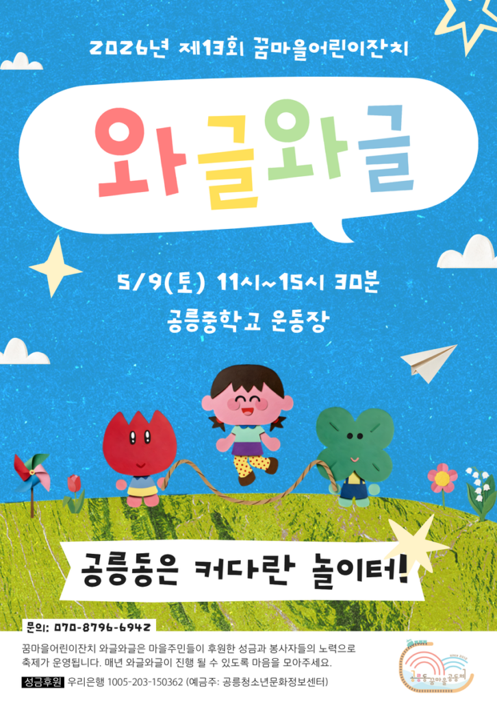 2026년 제13회 꿈마을 어린이잔치 와글와글 5/9(토) 11시 ~ 15시 30분 공릉중학교 운동장 공릉동은 커다란 놀이터! 문의 070-8796-6942 꿈마을어린이잔치 와글와글은 마을주민들이 후원한 성금과 봉사자들의 노력으로축제가 운영됩니다. 매년 와글와글이 진행될 수 있도록 마음을 모아주세요. 성금후원 우리은행 1005-203-150362(예금주: 공릉청소년문화정보센터)