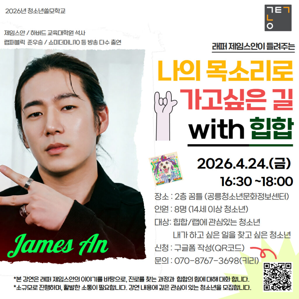 래퍼 제임스안이 들려주는 [청소년 쓸모학교] “나의 목소리로 가고싶은 길 with 힙합” 제임스안 : 하버드교육대학원 석사/ 랩퍼블릭 준우승 / 쇼미더머니10등 방송 다수 출연 일시 : 2026.4.24.(금) 16:30 ~18:00장소 : 2층 꿈틀 (공릉청소년문화정보센터)인원 : 8명 (14세 이상 청소년)대상: 힙합/랩에 관심있는 청소년, 내가 하고 싶은 일을 찾고 싶은 청소년신청 및 문의 : 070-8767-3698(키리) *본 강연은 래퍼 제임스안의 이야기를 […]