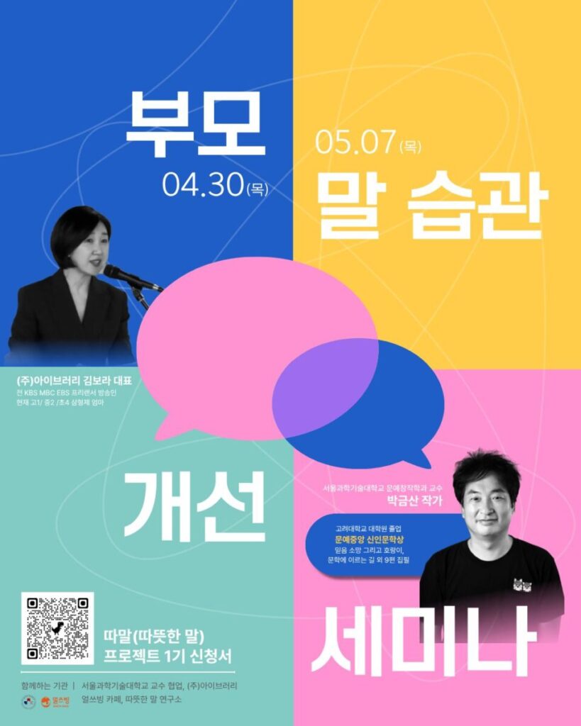 부모 말습관 개선 세미나 04.30 (목) 05.07 (목) (주)아이브러리 김보라 대표전 KBS MBC EBS 프리랜서 방송인현재 고1 / 중2 / 초4 삼형제 엄마 서울과학기술대학교 문예창작학과 교수박금산 작가 고려대학교 대학원 졸업문예중앙 신인문학상믿음 소망 그리고 희망이,문학에 이르는 길 외 9편 집필 따말 (따뜻한 말)프로젝트 1기 신청서 함께하는 기관서울과학기술대학교 교수 협업, (주)아이브러리얼쓰빙 카페, 따뜻한 말 연구소