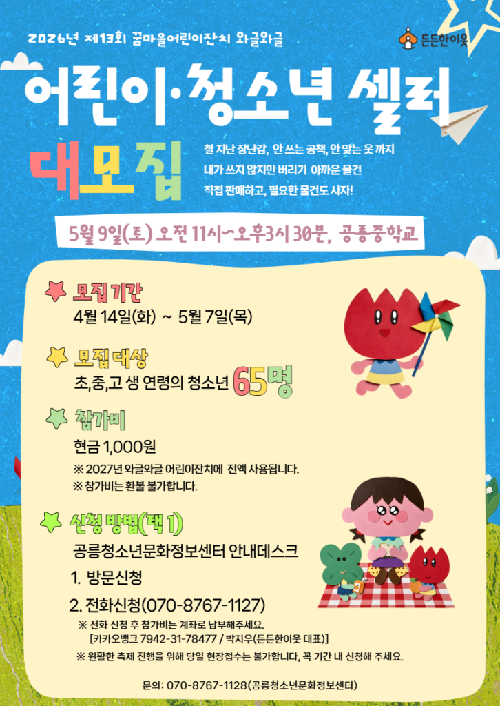어린이·청소년 벼룩장터 셀러 모집 🛍️ 집에 안 쓰는 물건 있나요?그냥 두지 말고 직접 팔아보는 경험, 어때요? 😊 내 물건도 팔고, 필요한 물건도 살 수 있어요! 📅 5/9(토) 11:00~15:30📍 공릉중학교👦 초·중·고 청소년 65명💰 참가비 1,000원 📝 신청: ~5/7까지(방문 또는 📞 070-8767-1127)※ 선착순 / 당일 신청은 어려워요 🙏 📞 문의: 070-8767-1128(공릉청소년문화정보센터) 👉 친구랑 같이 참여하면 더 재밌어요 […]